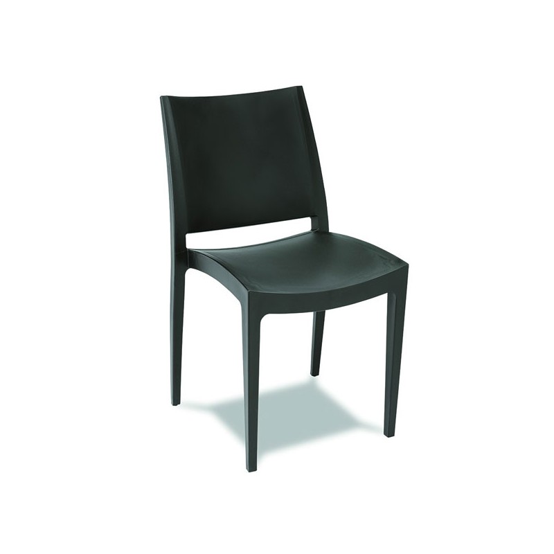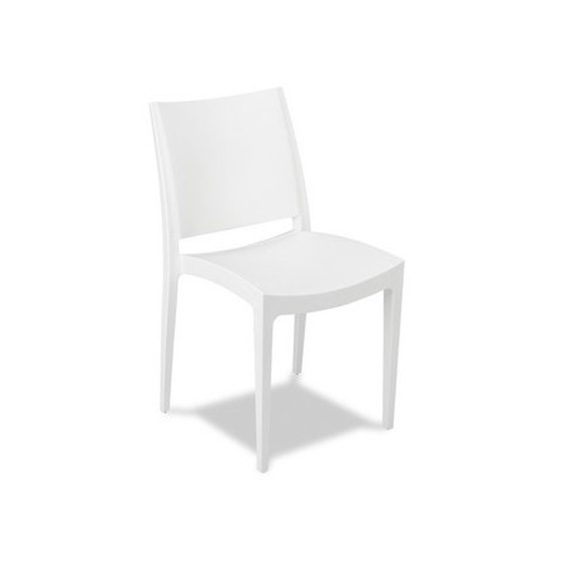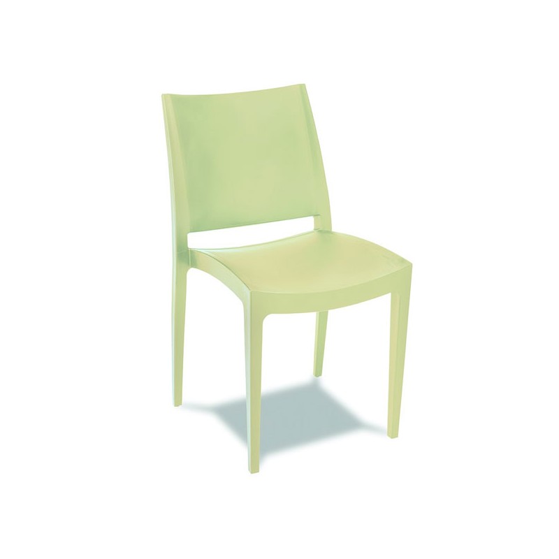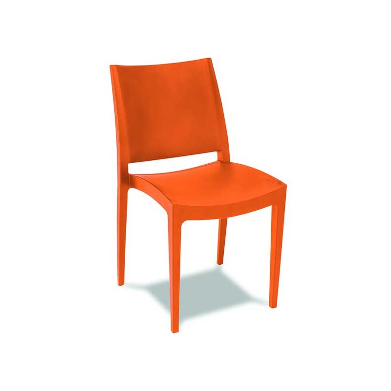 Silla para el uso en exteriores, también es apilable. Armazón monobloc, 100% polipropileno inyectado en gas.