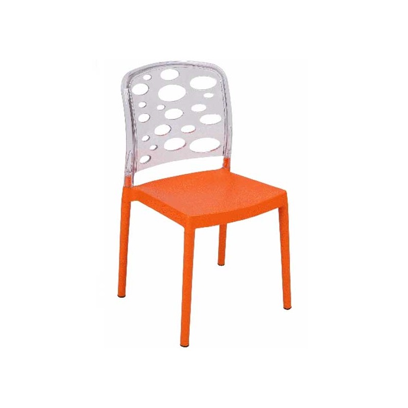 Idóneo asiento BUBBLEPC para uso en terraza o exterior. Fabricado con armazón en patas de tubo de aluminio anodizado cubiertas con plástico inyectado, asiento 100% polipropileno y respaldo de policarbonato (transparente) inyectado en gas.