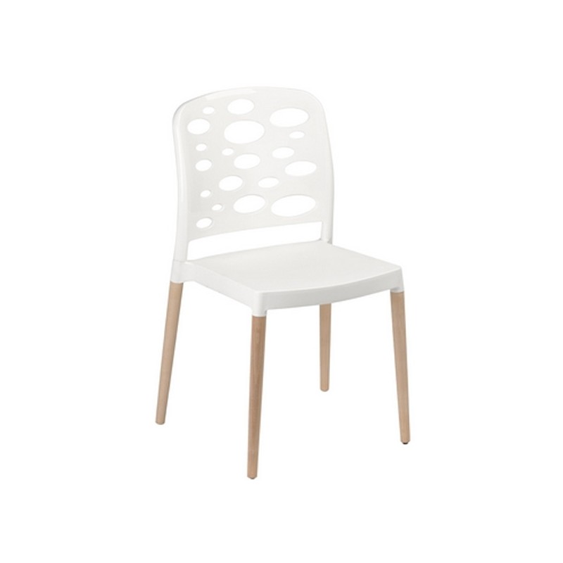 Excelente asiento con armazón en patas de madera de haya barnizada natural, asiento y respaldo en carcasa 100% polipropileno inyectado en gas proporcionando robustez, fiabilidad y comodidad. Uso en exteriores y apilable.