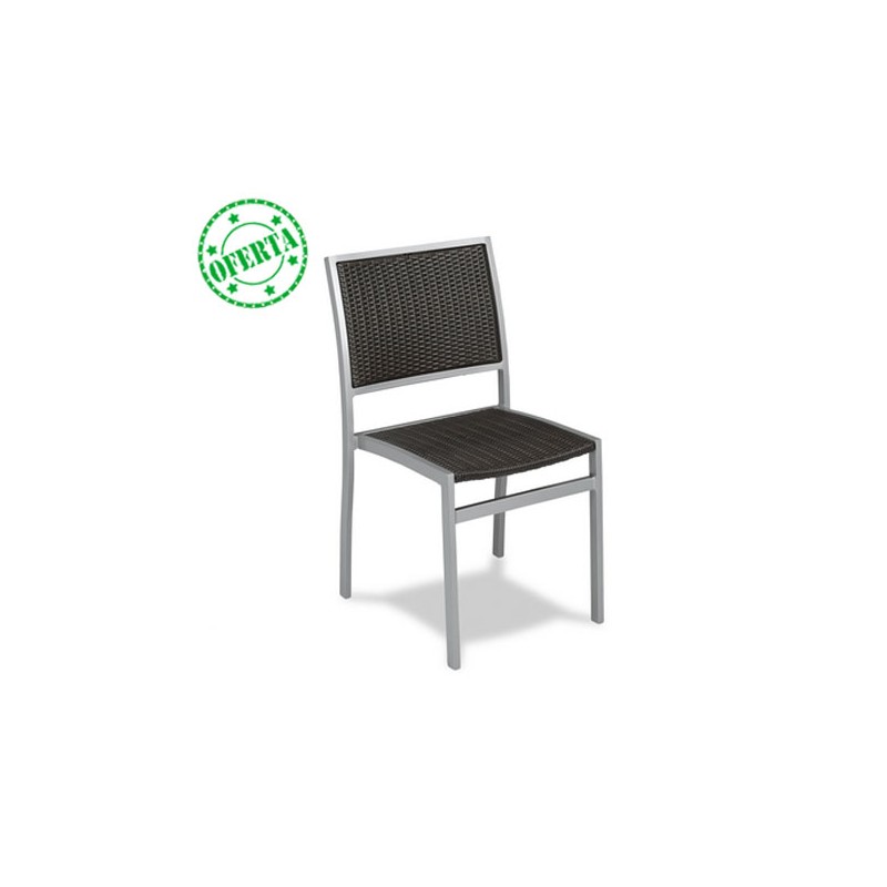 Silla para el exterior modelo 166 excelente para terraza. Esta silla fabricada con armazón en tubo de aluminio plastificado y asiento y respaldo con acabado de médula sintética 100% virgen no reciclada tejida a mano. Puede ser apilada.