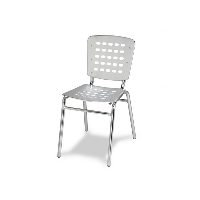 Silla apilable para el uso en exteriores. Armazón en tubo de aluminio. Asiento y respaldos en plancha de aluminio perforada. Los materiales han sido anodizados otorgandoles un acabado perfecto.