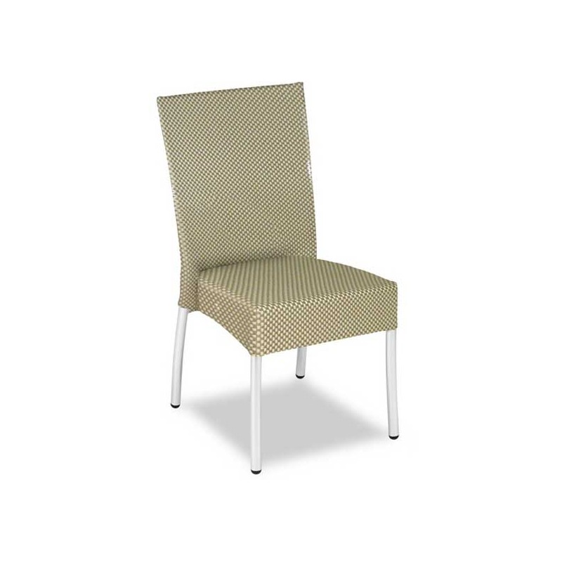 Silla para el uso en exteriores, se puede apilar. Armazón en tubo de aluminio anodizado. Asiento y respaldo en textiline.