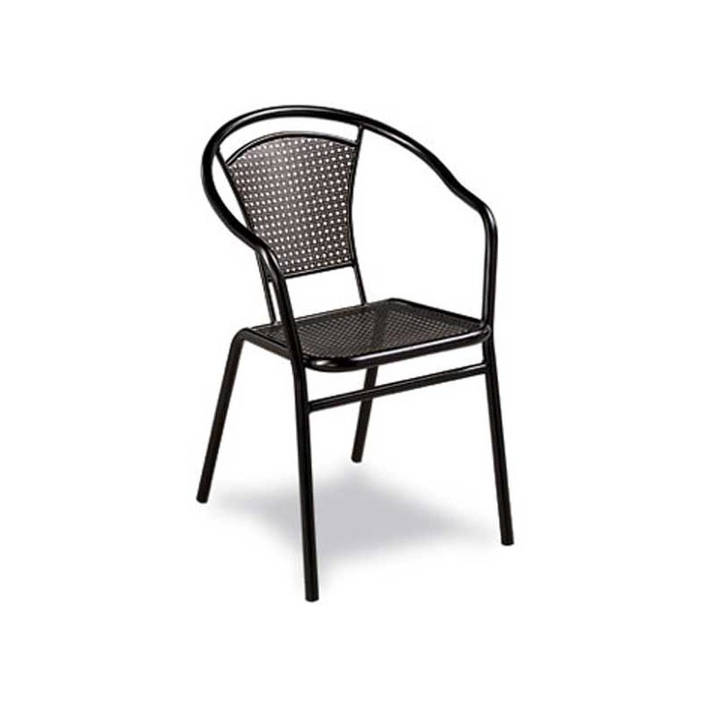 Sillón fabricado en tubo acerado con asiento y respaldo en rejilla metálica. Idóneo para el uso en interiores, apilable.