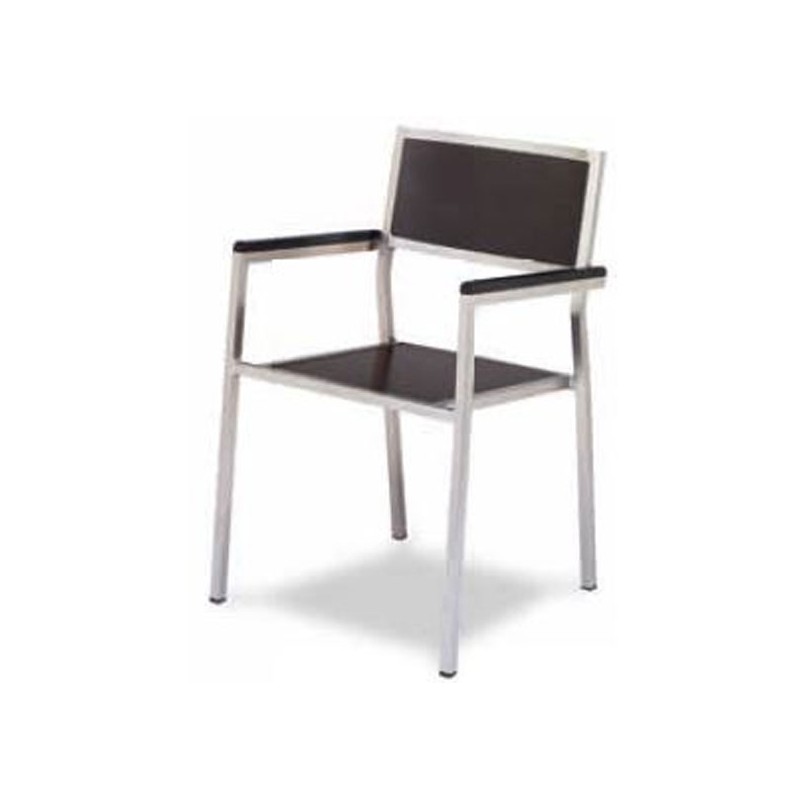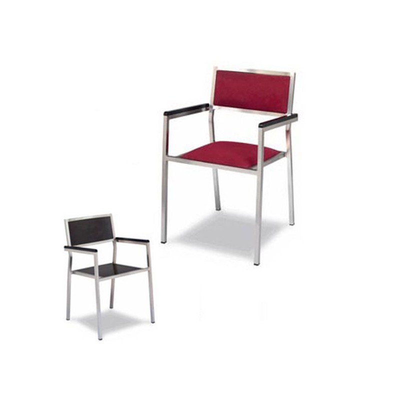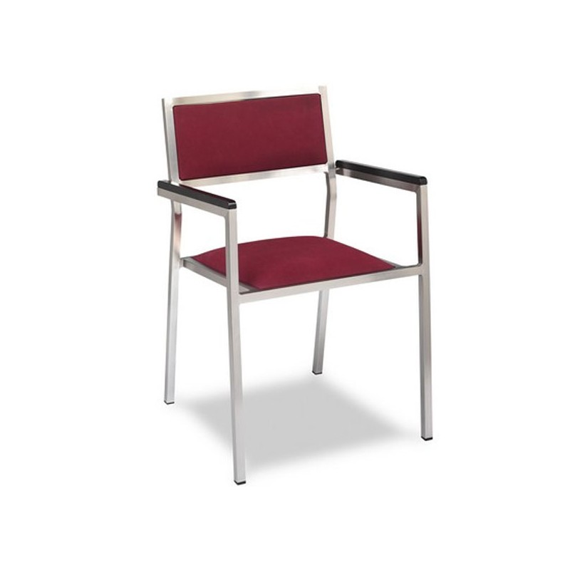 Sillón para uso en interior, apilable. Fabricado con armazón en tubo de aluminio anodizado, acabado en inox (Acero inoxidable), asiento y respaldo en tapizado o en madera de haya contrachapada y barnizada.