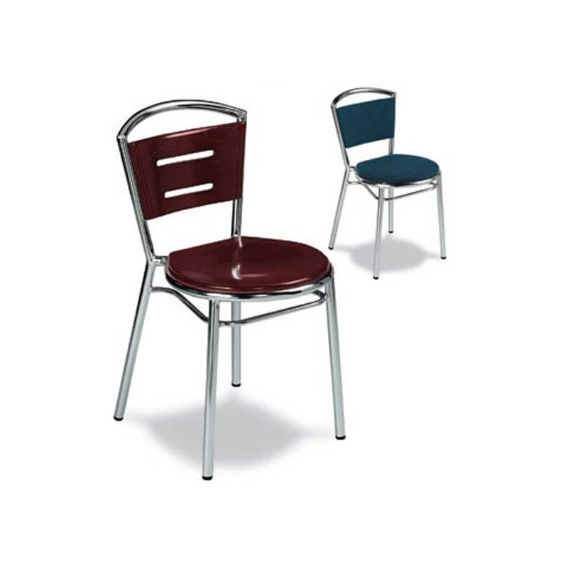Silla apilable para el uso en interiores. Armazón en tubo aluminio con un acabado anodizado, Asiento y respaldo a elegir entre madera o tapizado. Ofecemos la mejor calidad/precio. Aproveche la ocasión.